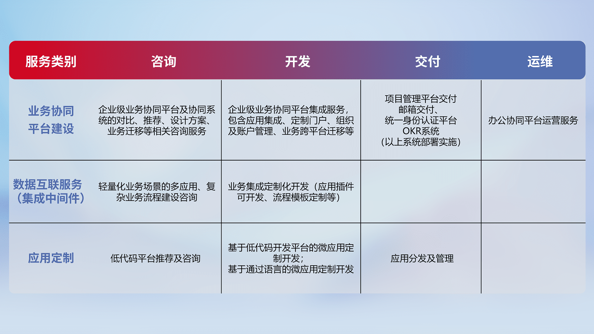 针对钉钉、、企微、、IDaas等平台级产品提供产品的规划、、、方案、、、、交付、、、定制化开发等服务,,实现如统一协同办公、、智能客户服务、、、、混合会议管理、、、、智能数据查询、、、等业务场景,,实现数字化转型。。