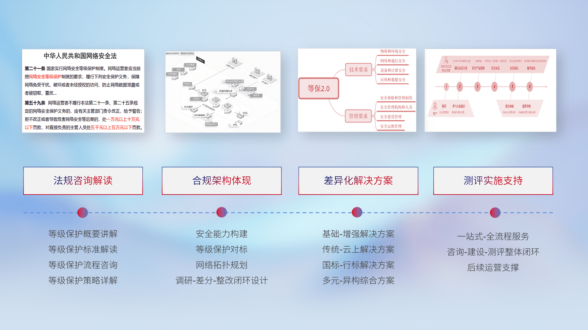 通过专业的法律咨询解读、、、合规架构体现、、差异化解决方案、、测试实施支持等服务,,,为客户量身打造等保合规体系。。。